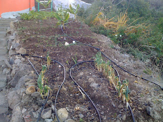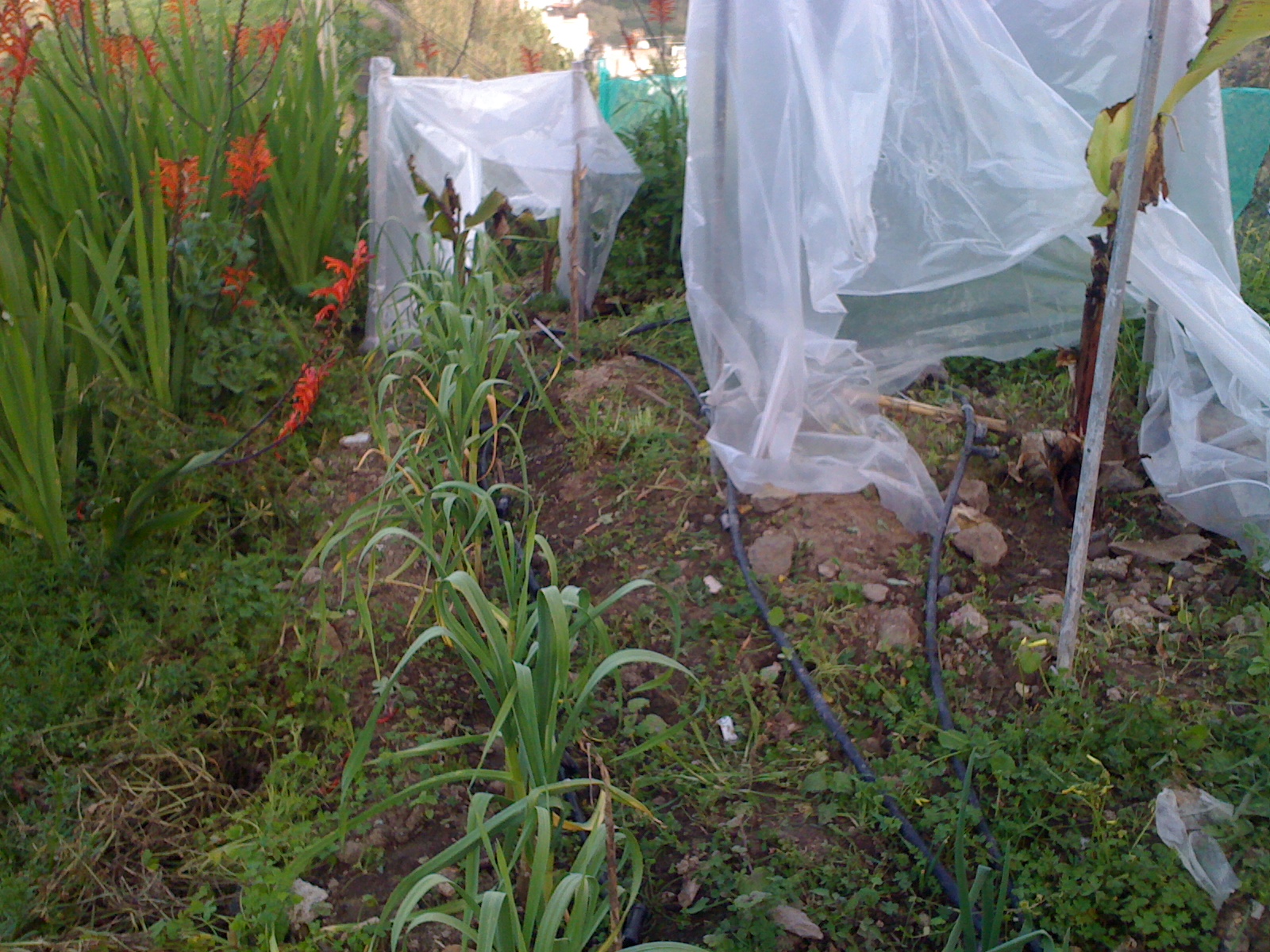 Mis ajos en el huerto con las plataneras tapadas por el frio