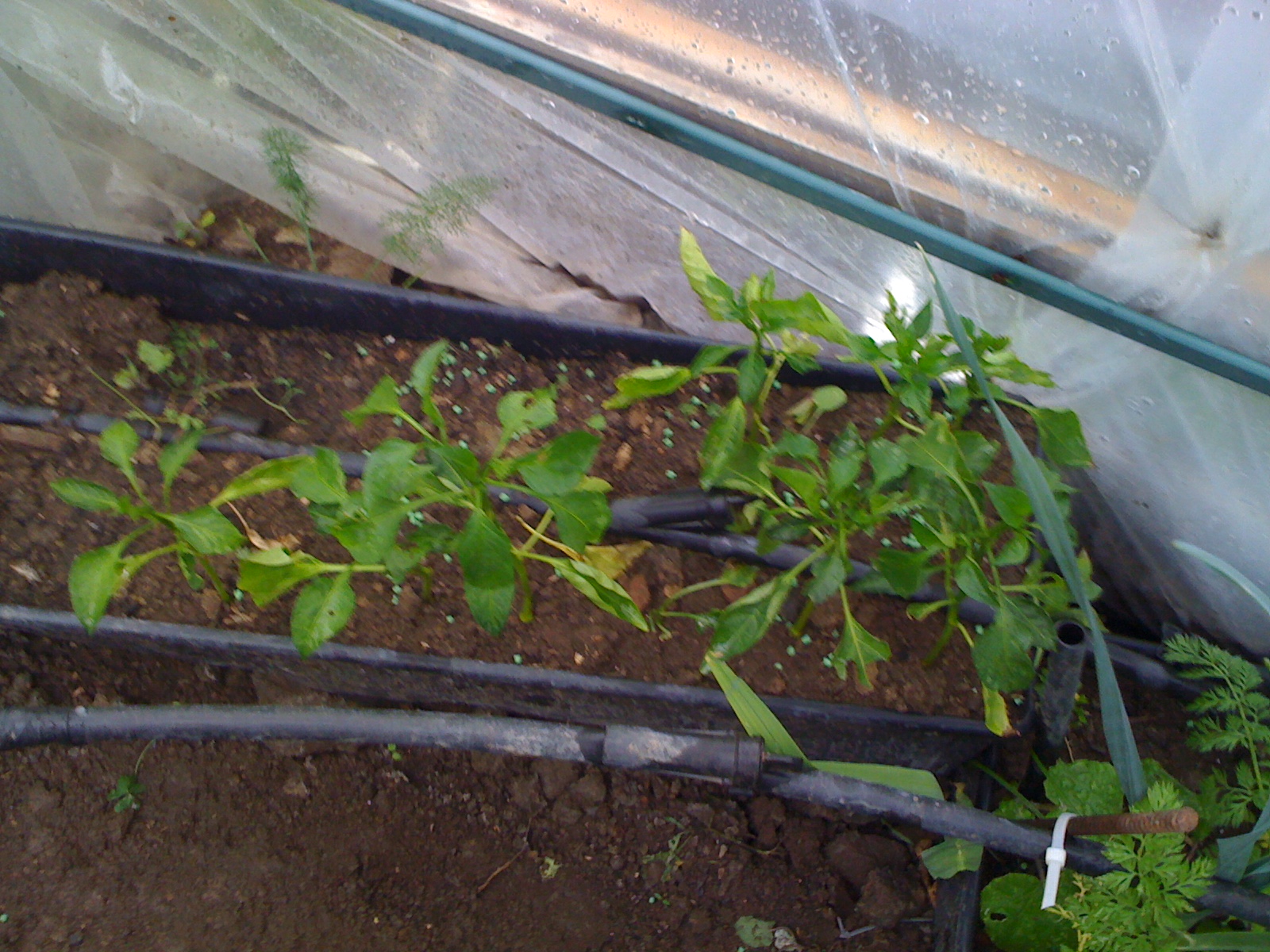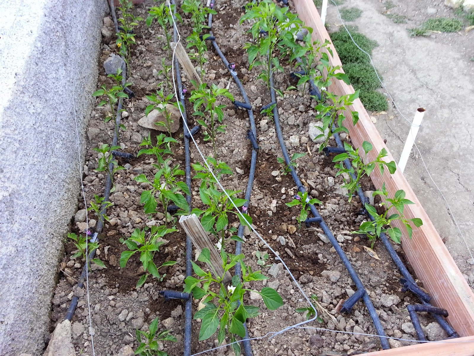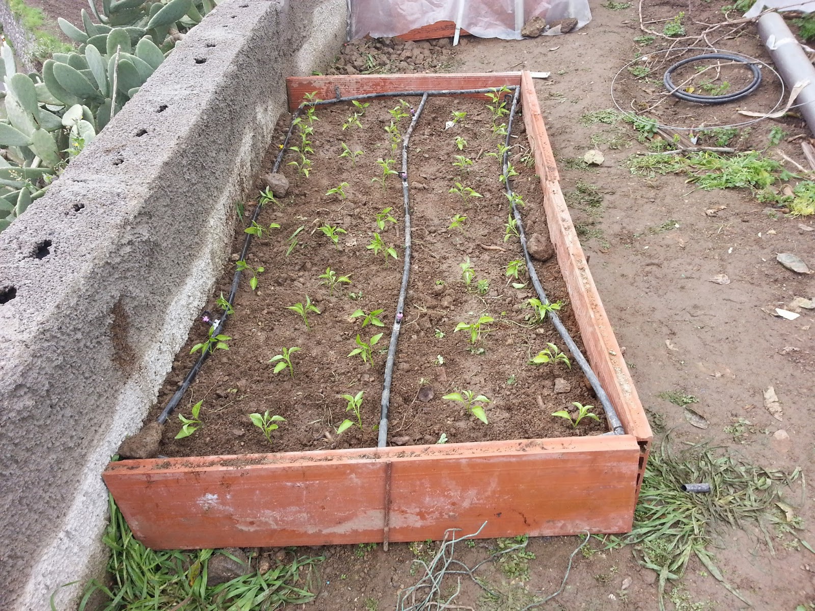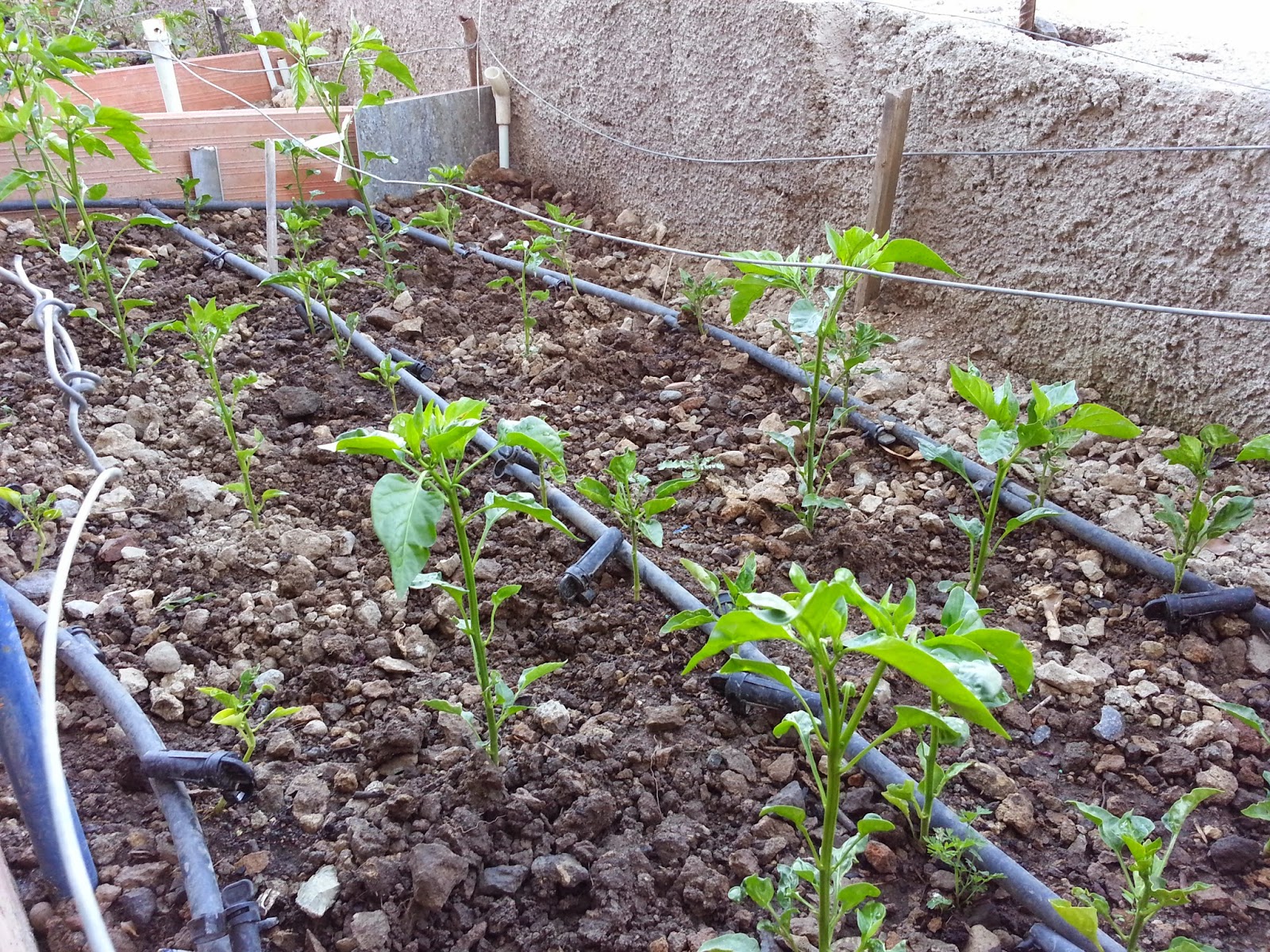 Hemos plantado pimientos también en un bancal del invernadero para comparar resultados los de afuera con los del invernadero