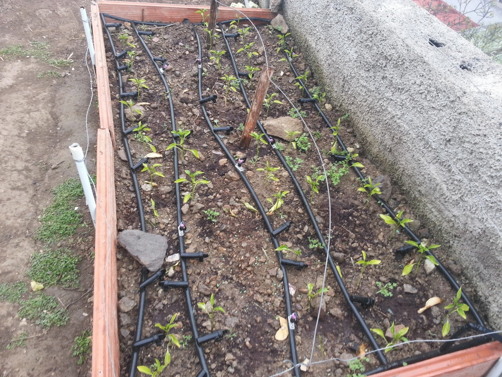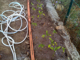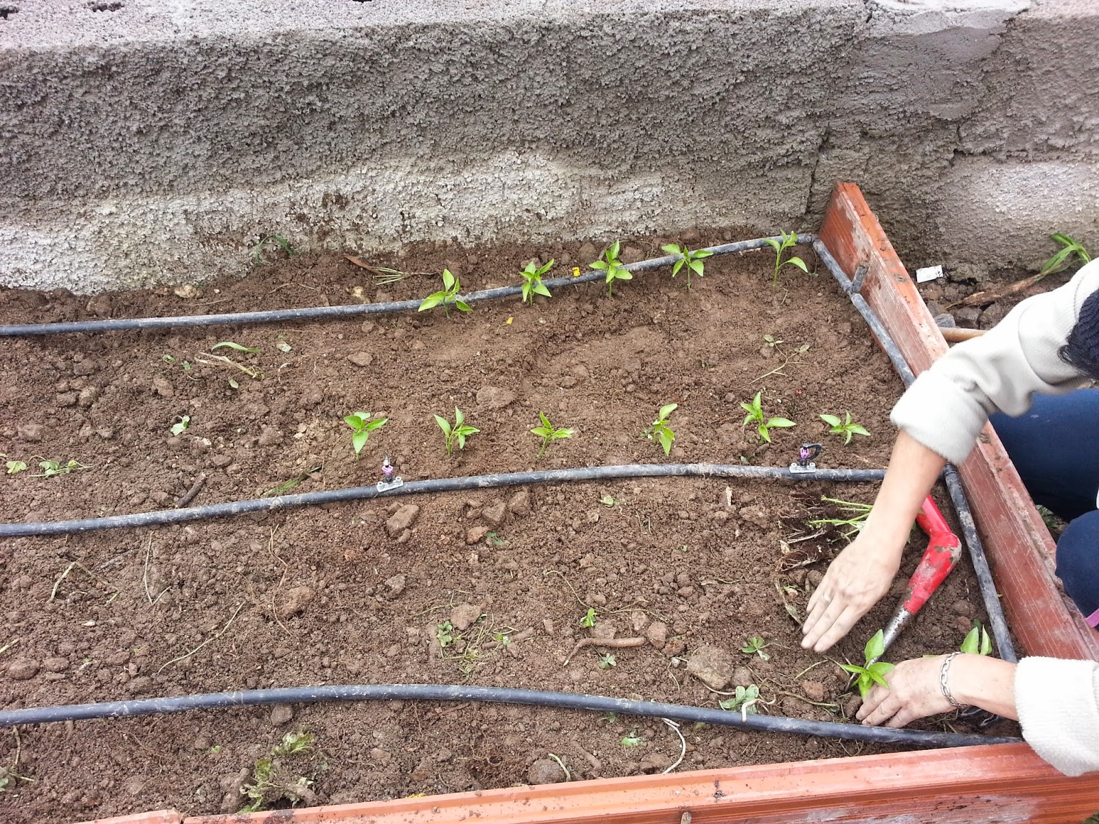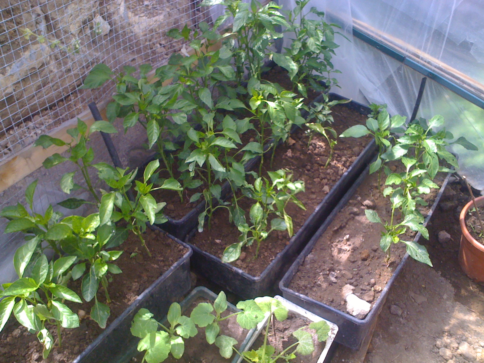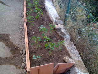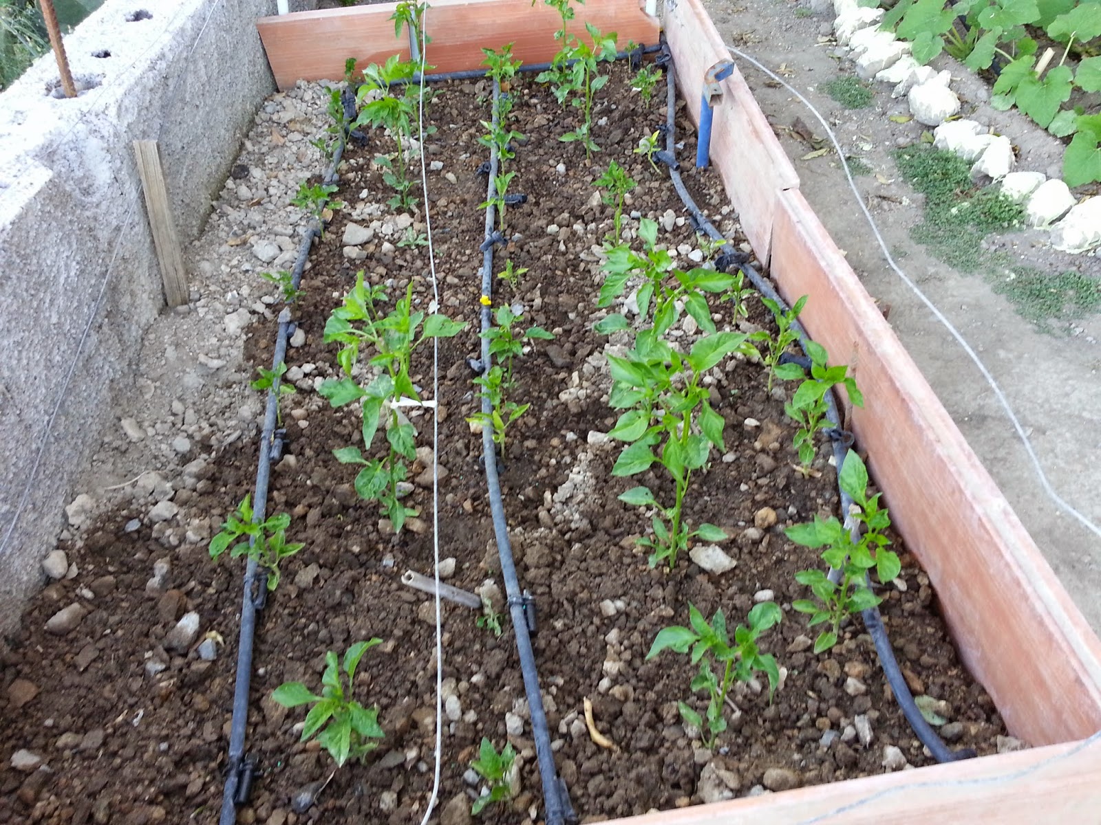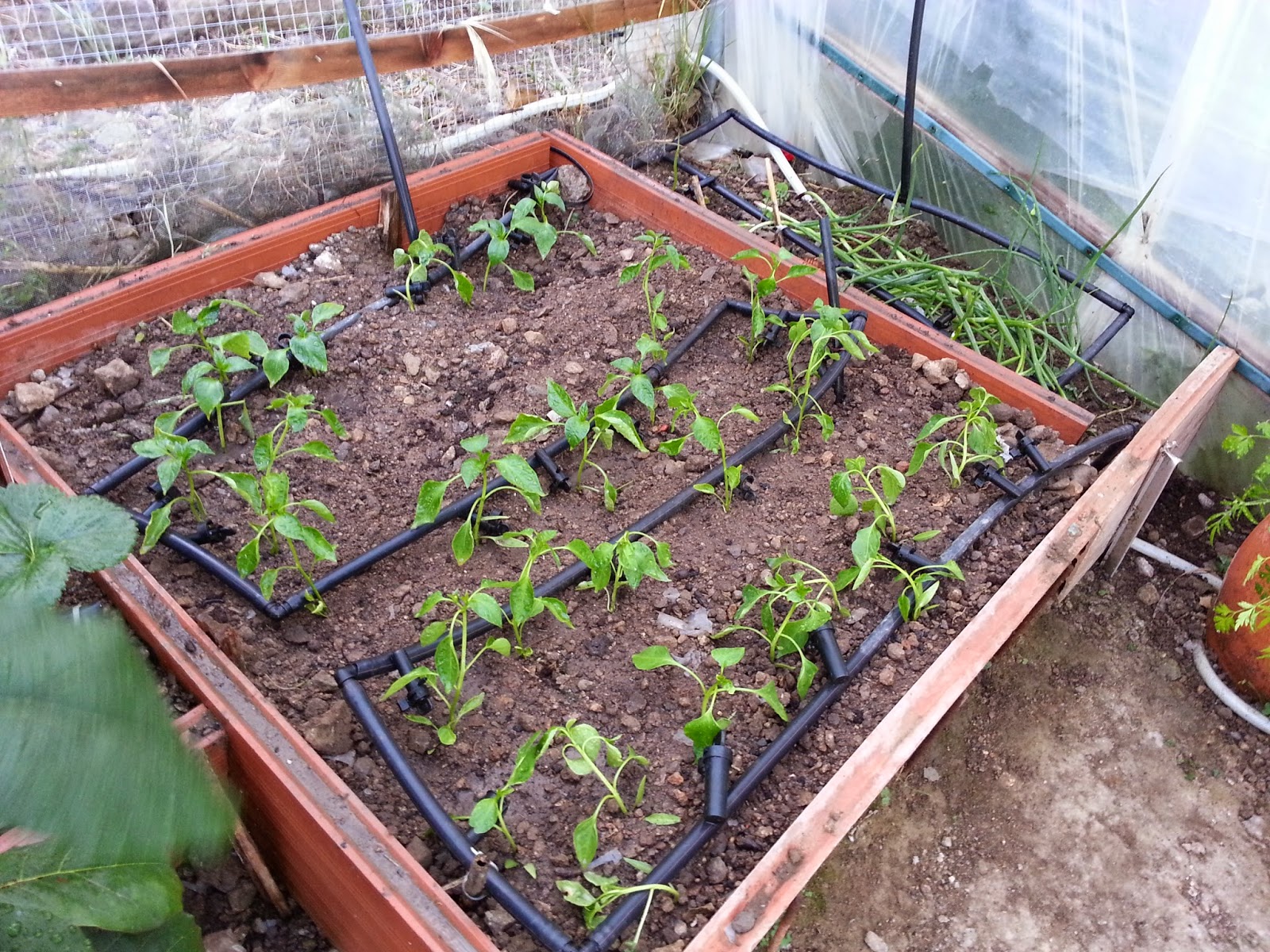 Hemos plantado pimientos también en un bancal del invernadero para comparar resultados los de afuera con los del invernadero