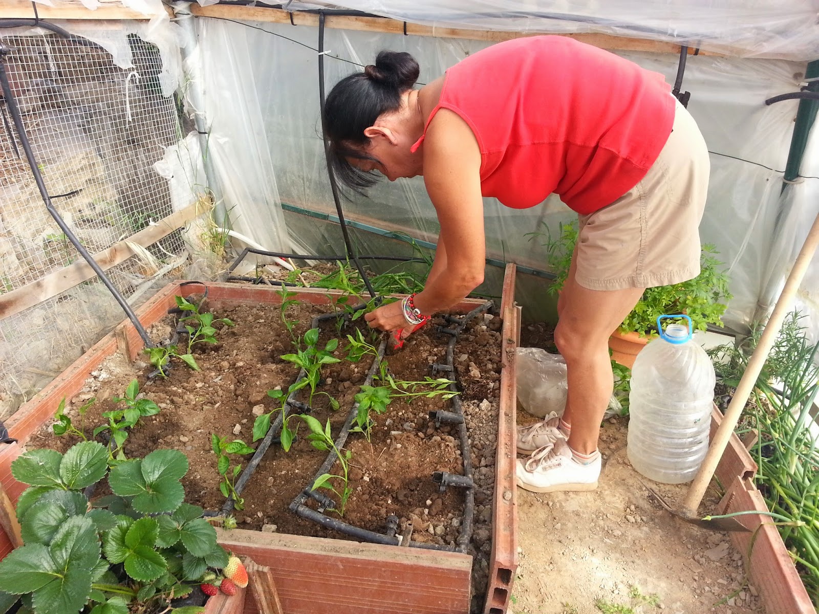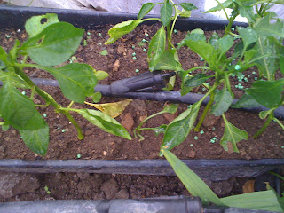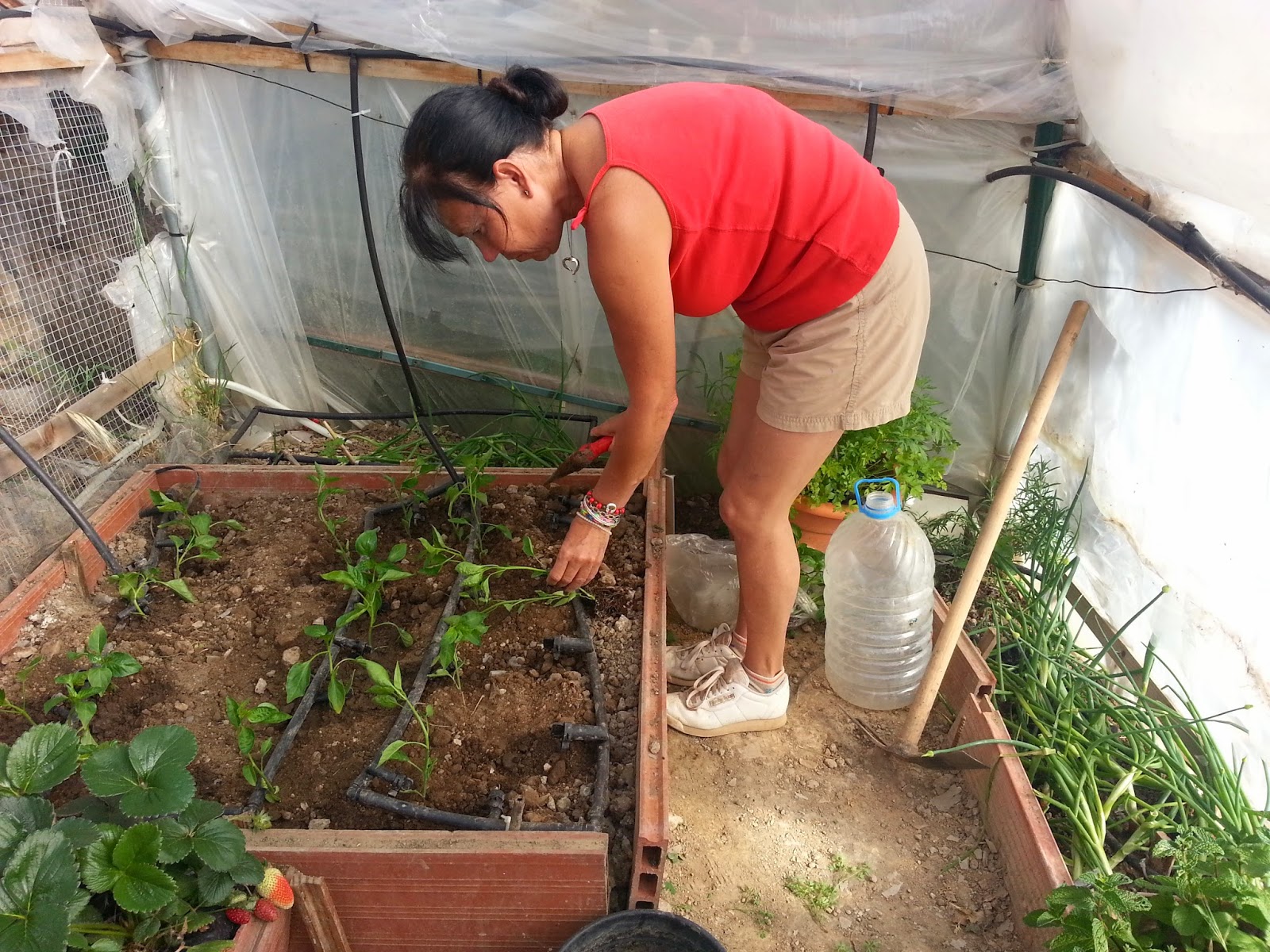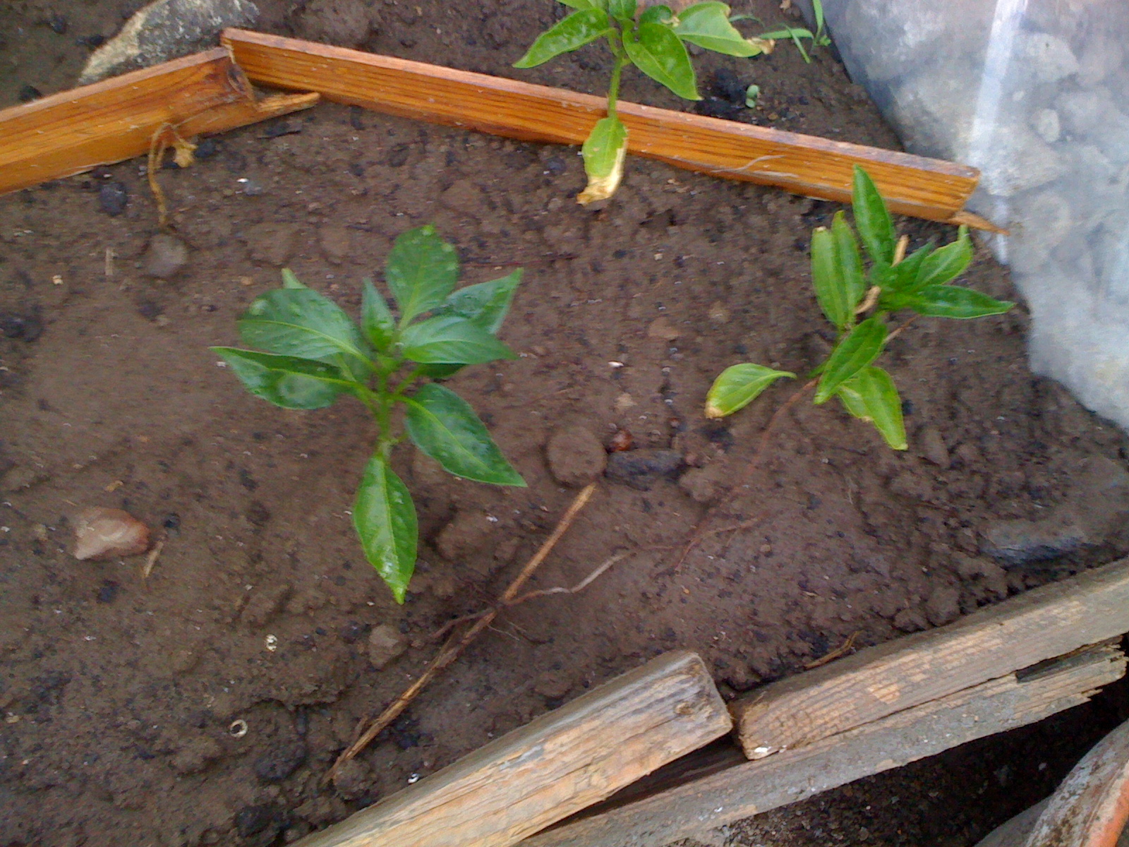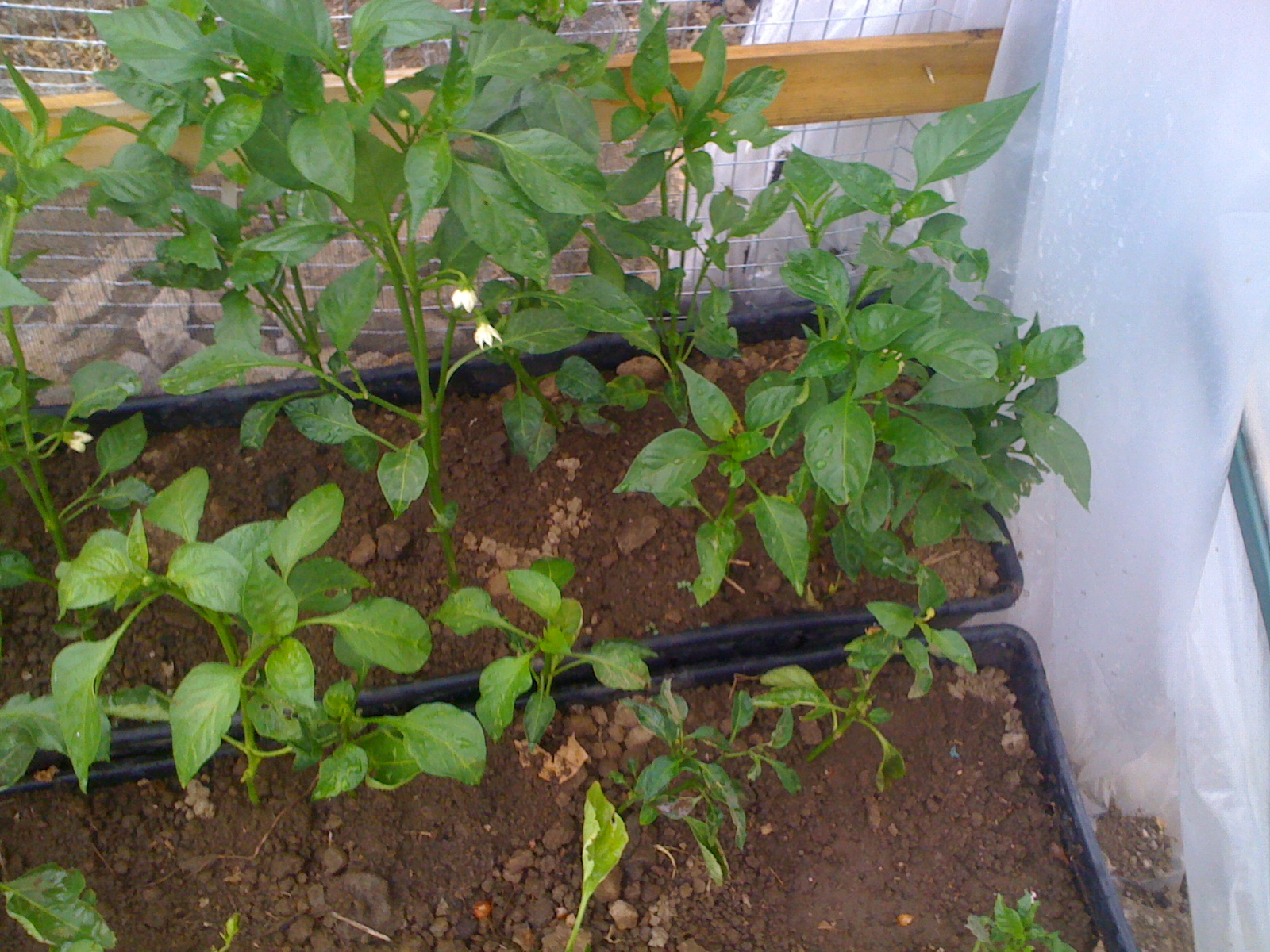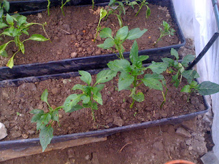 Hemos plantado pimientos también en un bancal del invernadero para comparar resultados los de afuera con los del invernadero