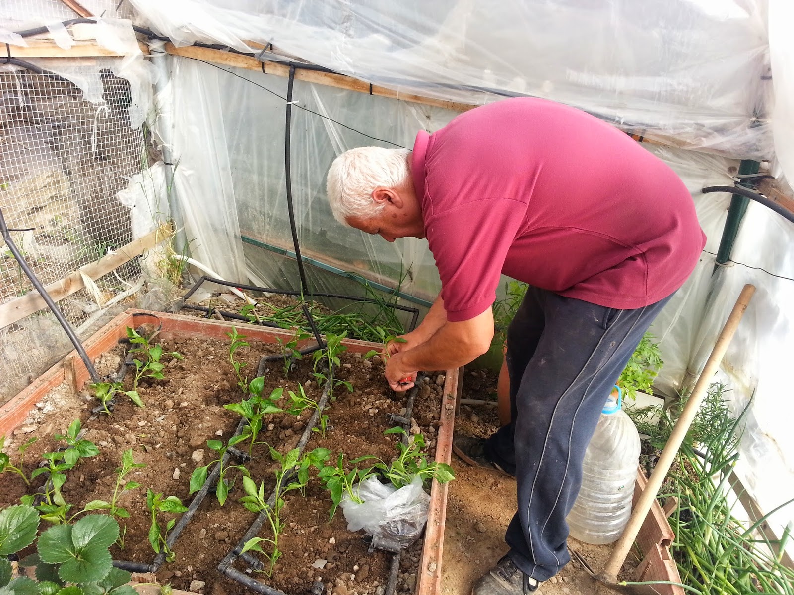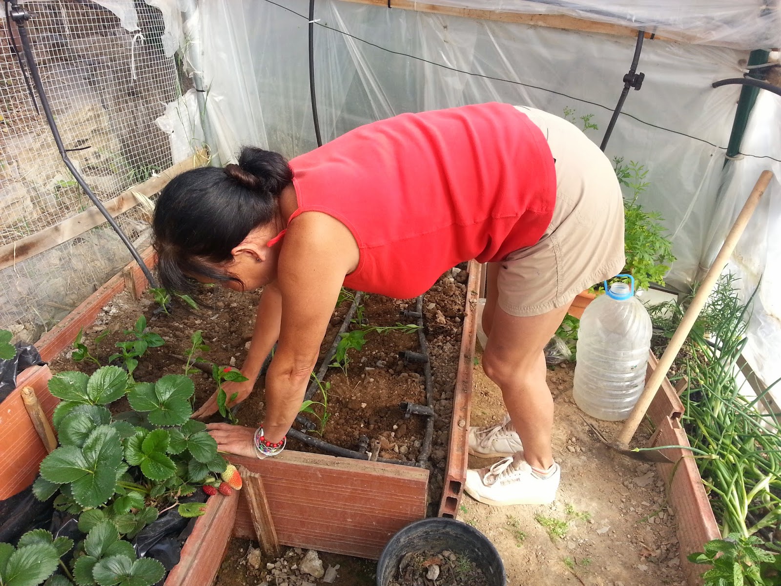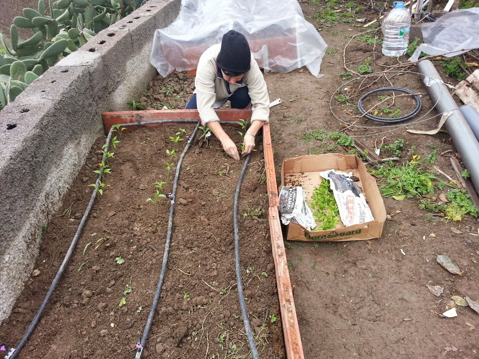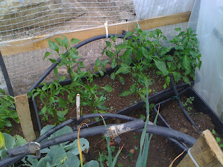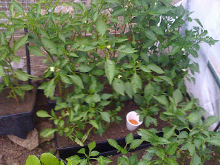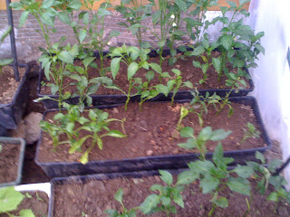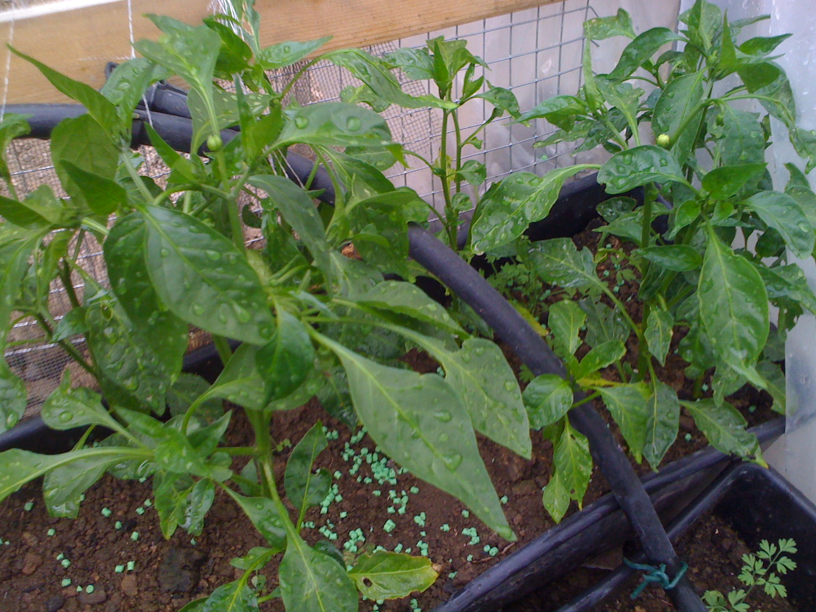Hemos plantado pimientos también en un bancal del invernadero para comparar resultados los de afuera con los del invernadero