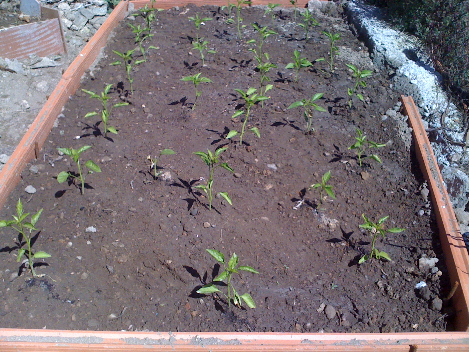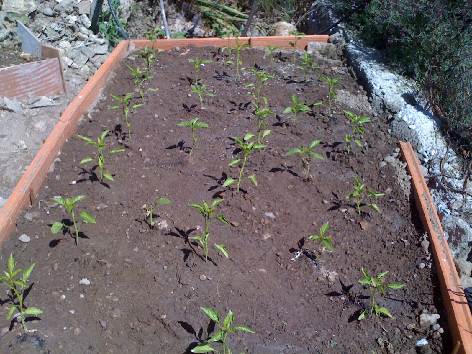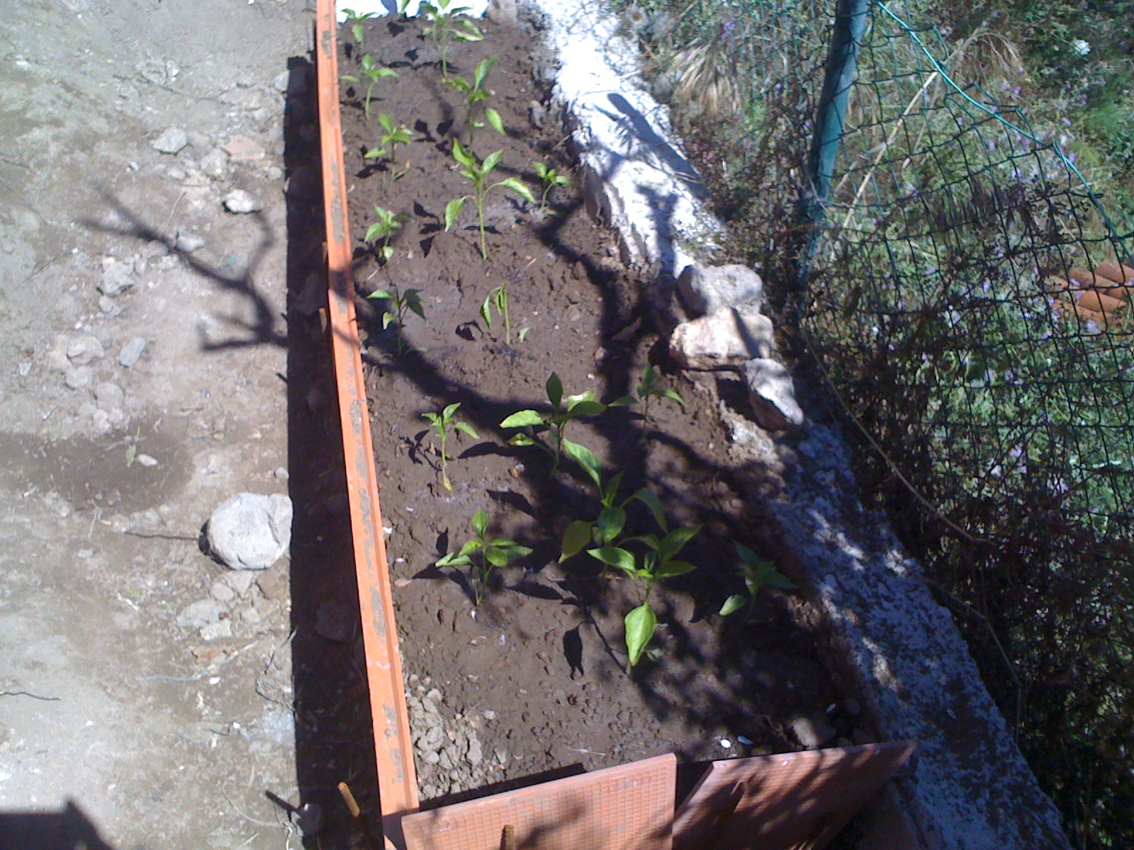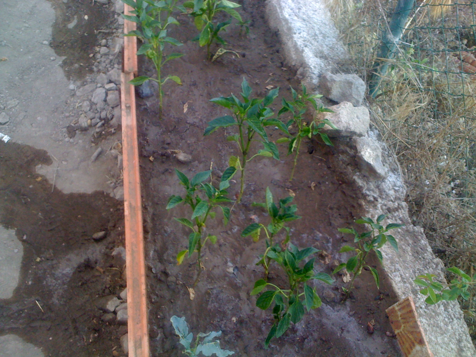 ha habido un problema y algún bicho se ha cargado unos cuantos pimientos pero hoy día 24 de mayo compre 10 plantones mas para reponer los que se han comido hemos puesto borras de café y el veneno de los caracoles haber que tal resulta tenemos en este bancal italianos padrón y rojos una mezcla