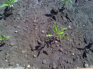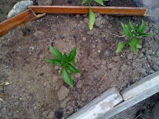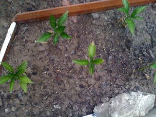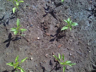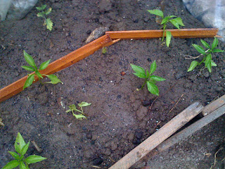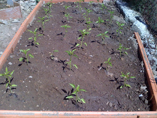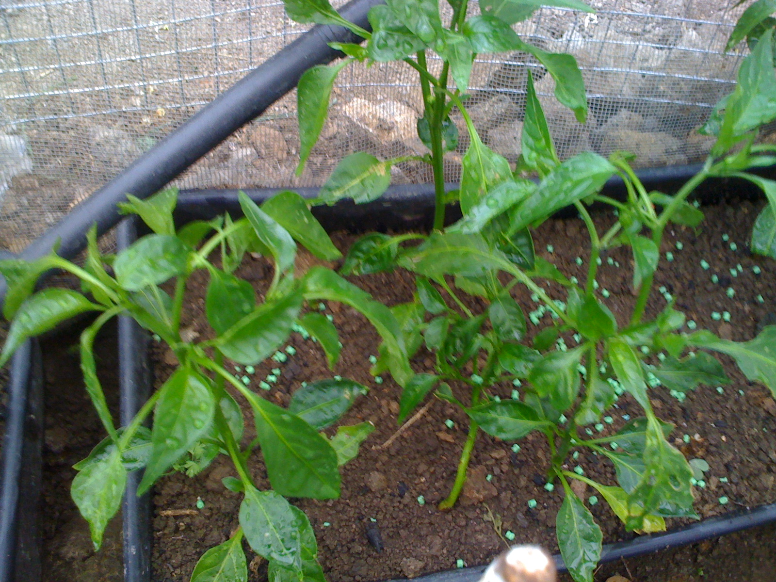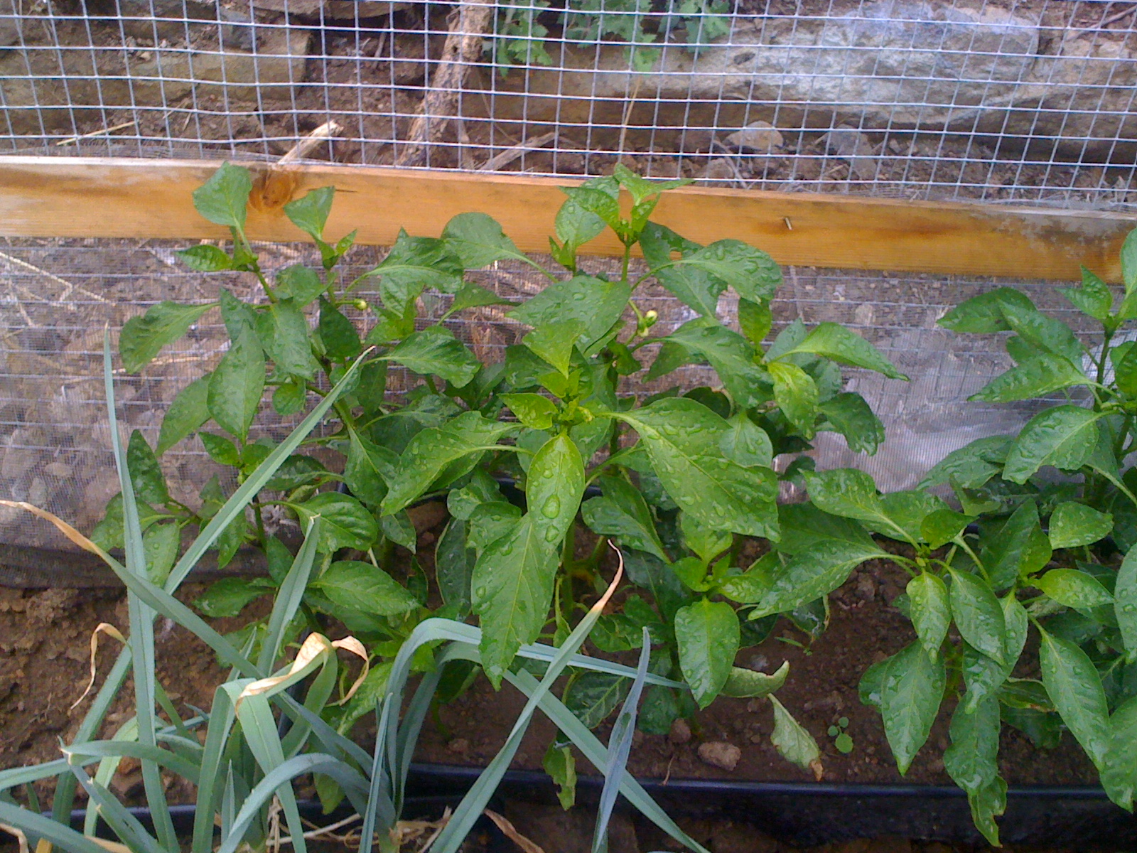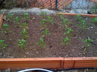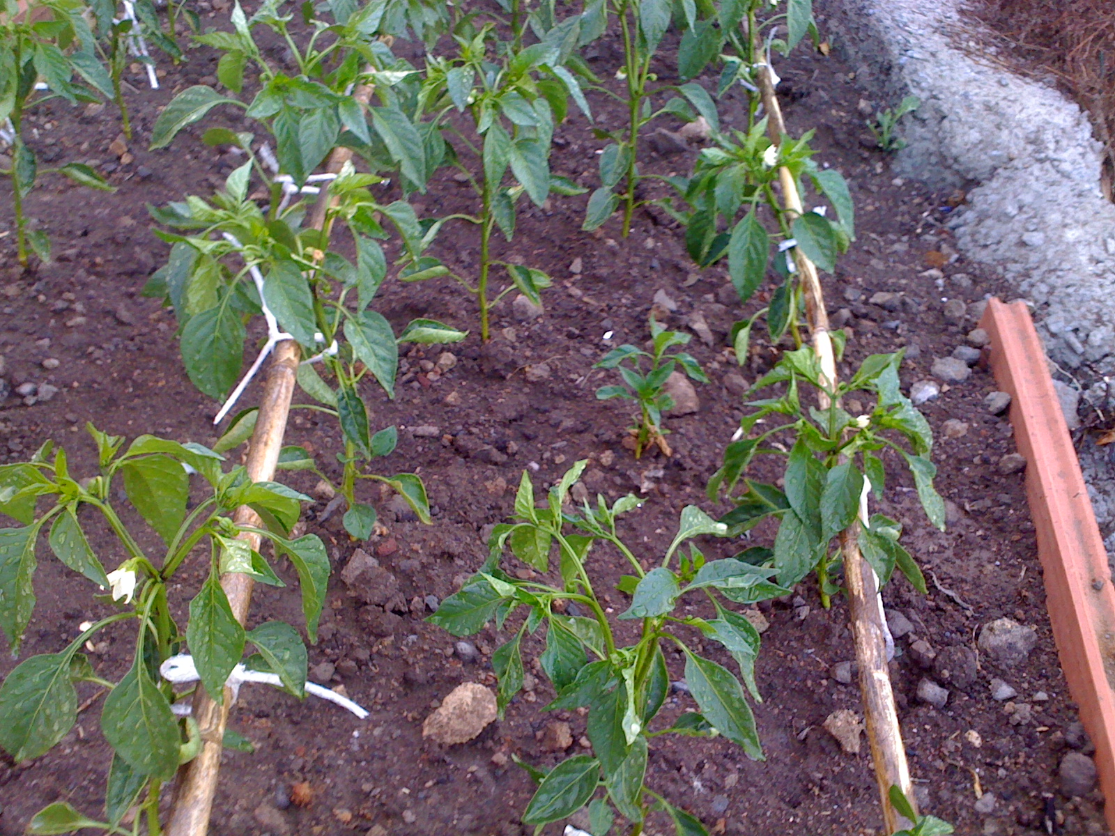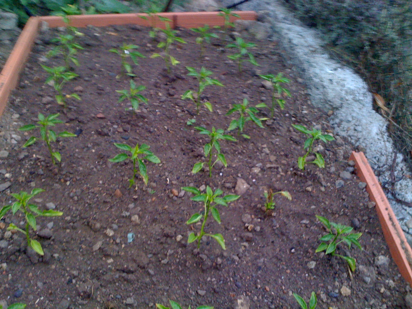 ha habido un problema y algún bicho se ha cargado unos cuantos pimientos pero hoy día 24 de mayo compre 10 plantones mas para reponer los que se han comido hemos puesto borras de café y el veneno de los caracoles haber que tal resulta tenemos en este bancal italianos padrón y rojos una mezcla