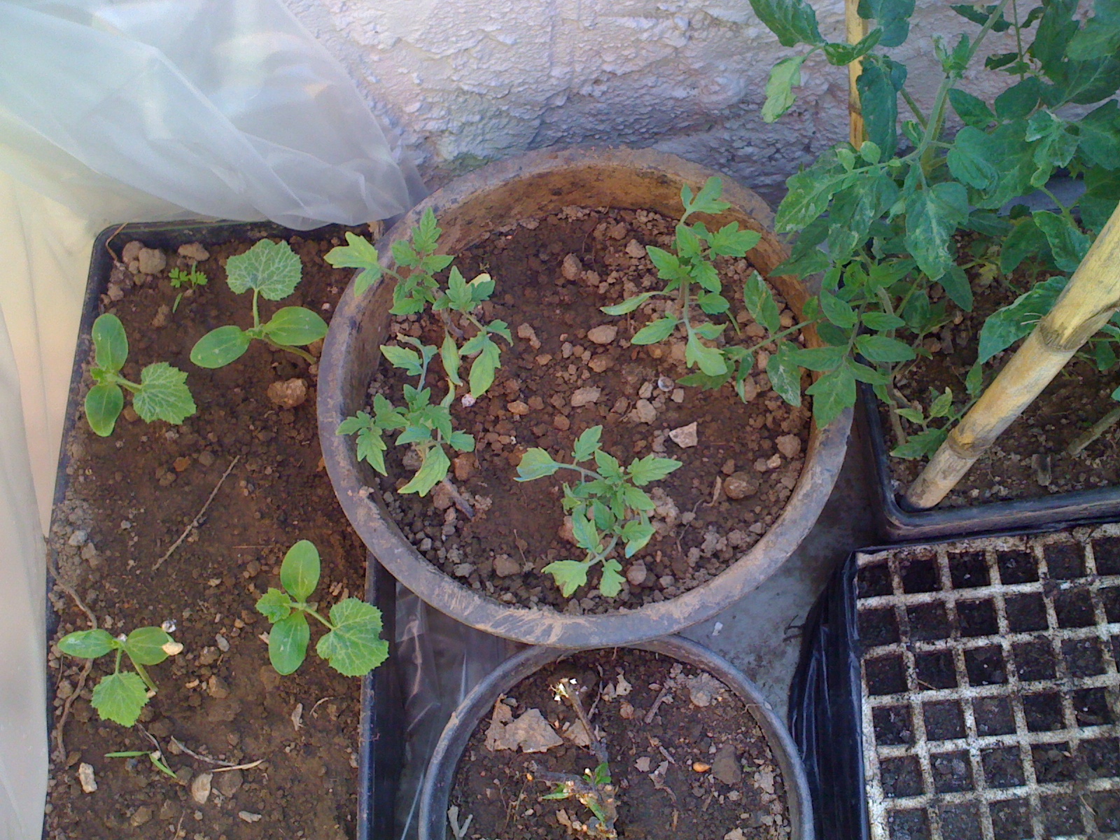 Nuevas tomateras plantadas en maceta redonda pequeña y al lado calabacinos