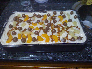 el melocoton y la piña que sobro lo pones por encima y si quieres un poco de cococo rayado un paquete de malteser y ya listo veras que rica es